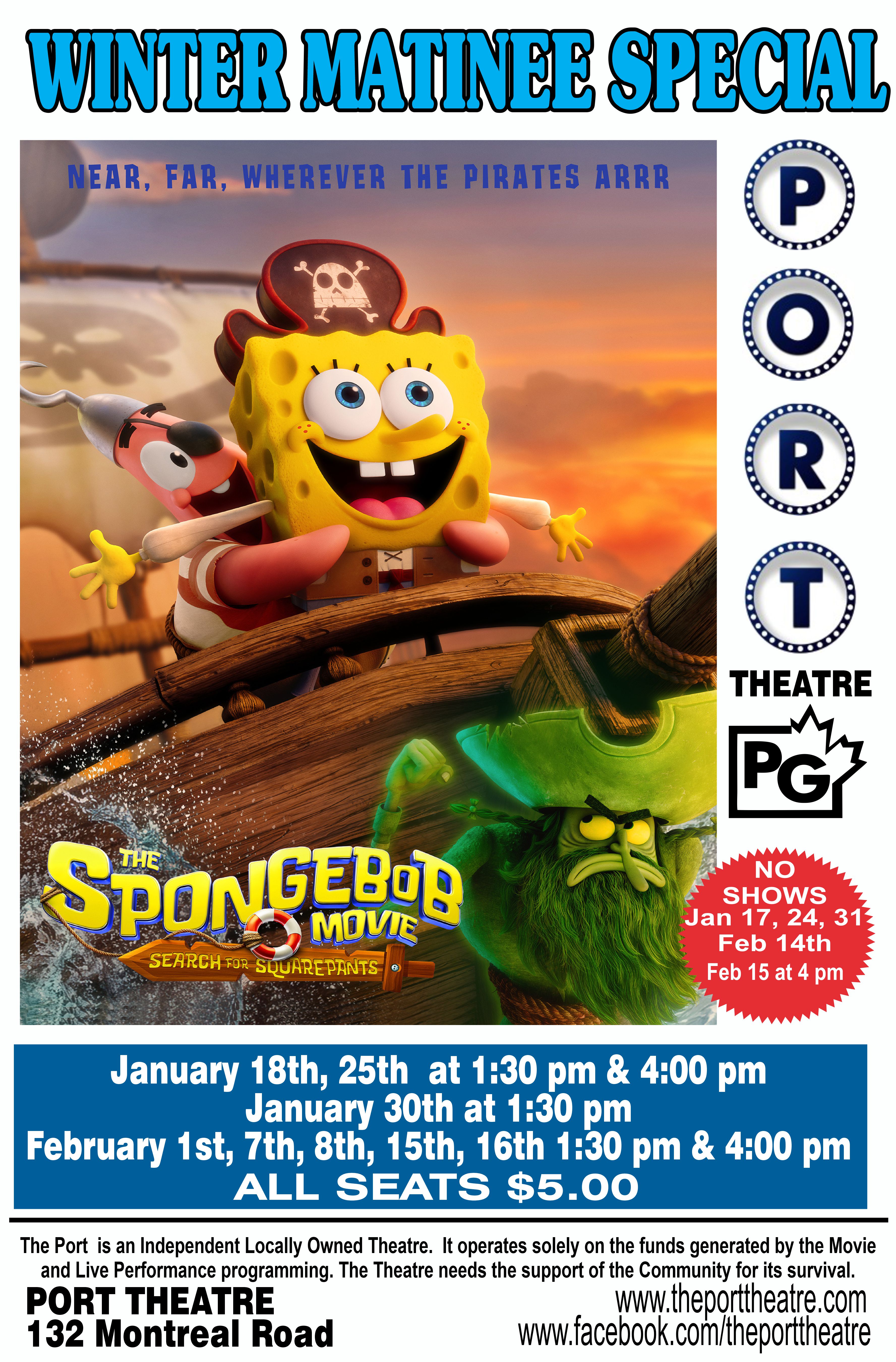 The Spongebob Movie – Search for Squarepants (Matinee) Feb 1 The Spongebob Movie – Search for Squarepants (Matinee) 1:30 pm - 3:15 pm $5