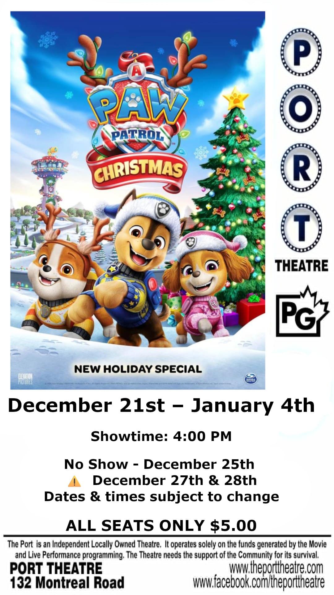A Paw Patrol Christmas Featured January 1 @ 4:00 pm A Paw Patrol Christmas Port Theatre 132 Montreal Rd, Cornwall, Ontario, Canada $5.00